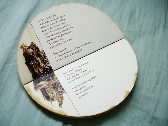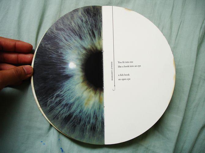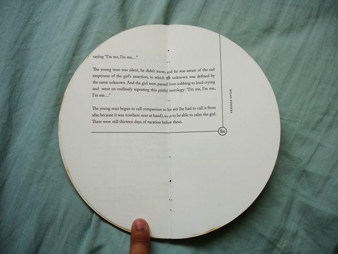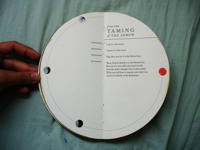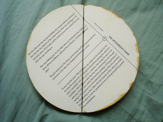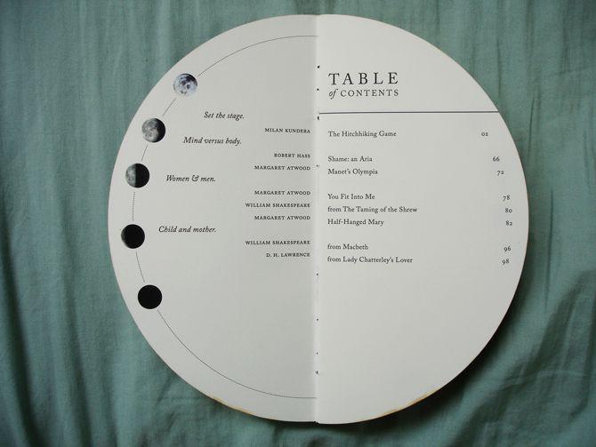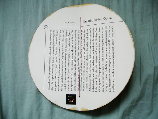 In Visual Communication 1, I purchased five objects and designed around them for ten weeks. The final book, on female gender, laser-cut and coptic-bound. The Hitchhiking Game, a short story by Milan Kundera, begins with a young couple on a road trip and ends with a deep divide between them. The text of the story rotates within the circle until, in the end, the gutter cuts straight down the center of the text. And the rest: PLUS Some infographics on the objects from the process book.