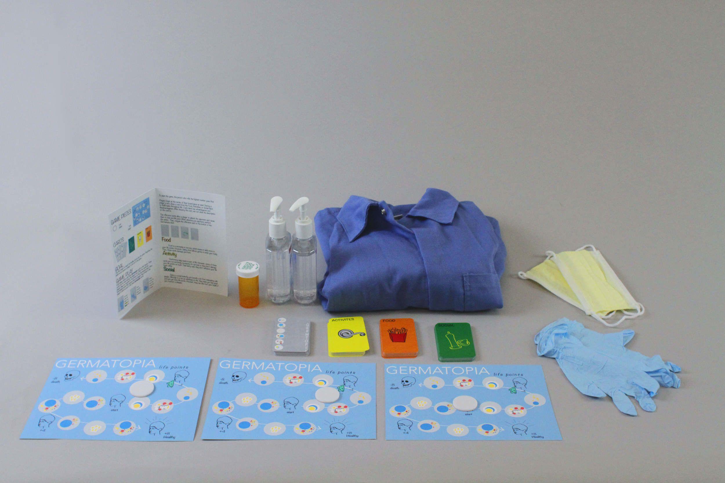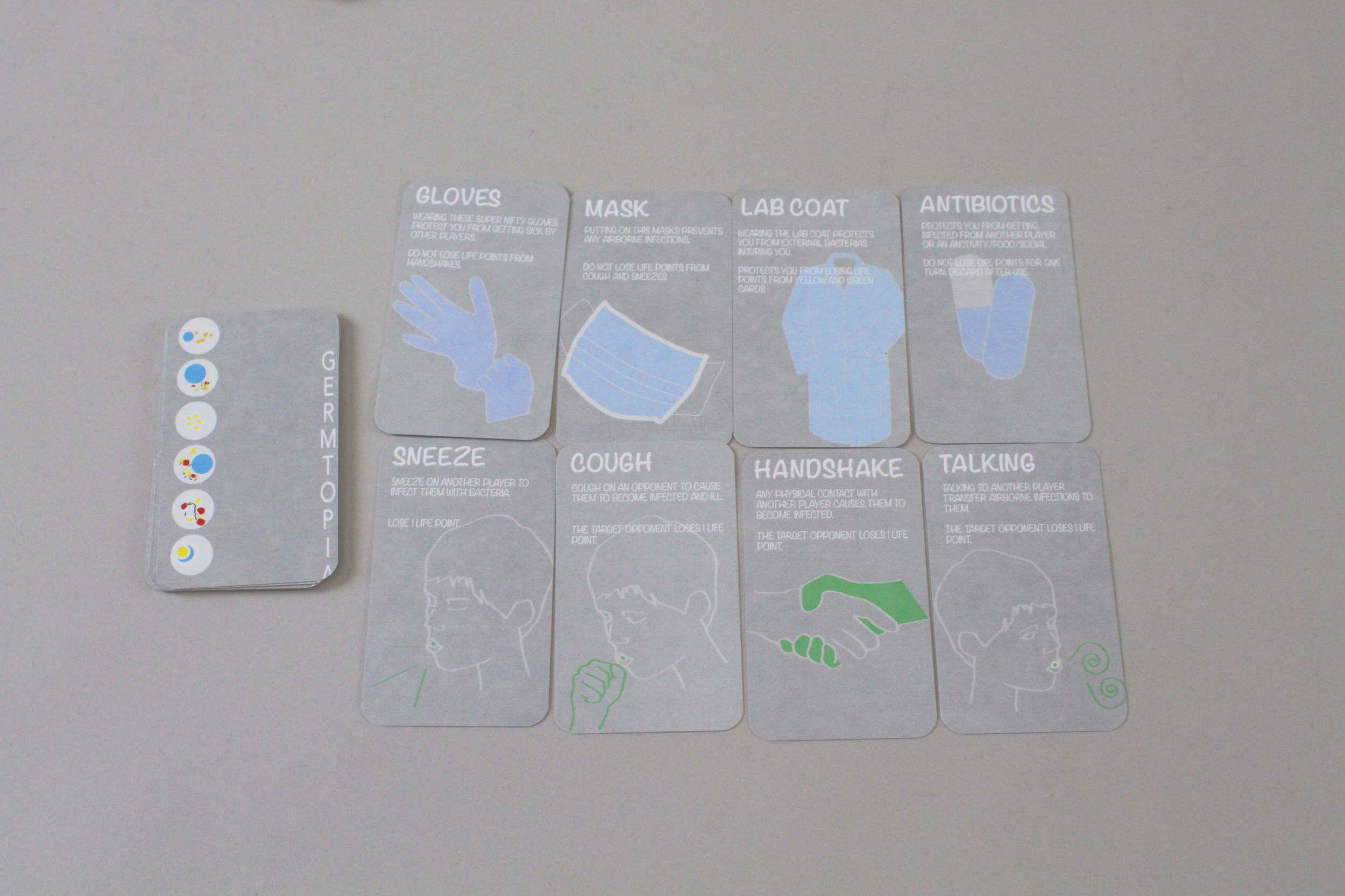 DESMA 157 GAME DESIGN | Final Project Objective: Survive in a germ infested world. Compete against your opponents and wisely choose equipment to protect yourself against your enemies. Players: 5-8 players Game Elements: - three decks of cards - costume attire - game board for each player Inspired by how germaphobic society has become, this game satirizes the idea of germs and bacteria being harmful.