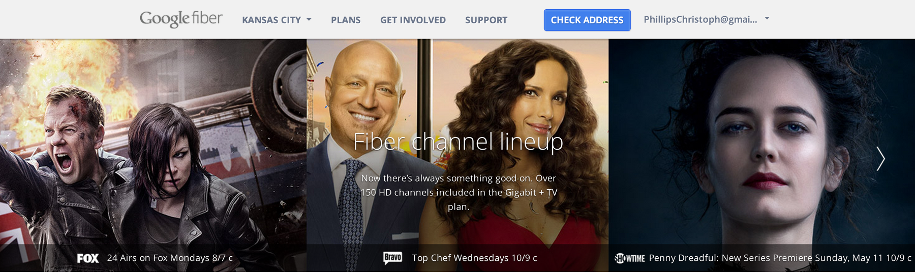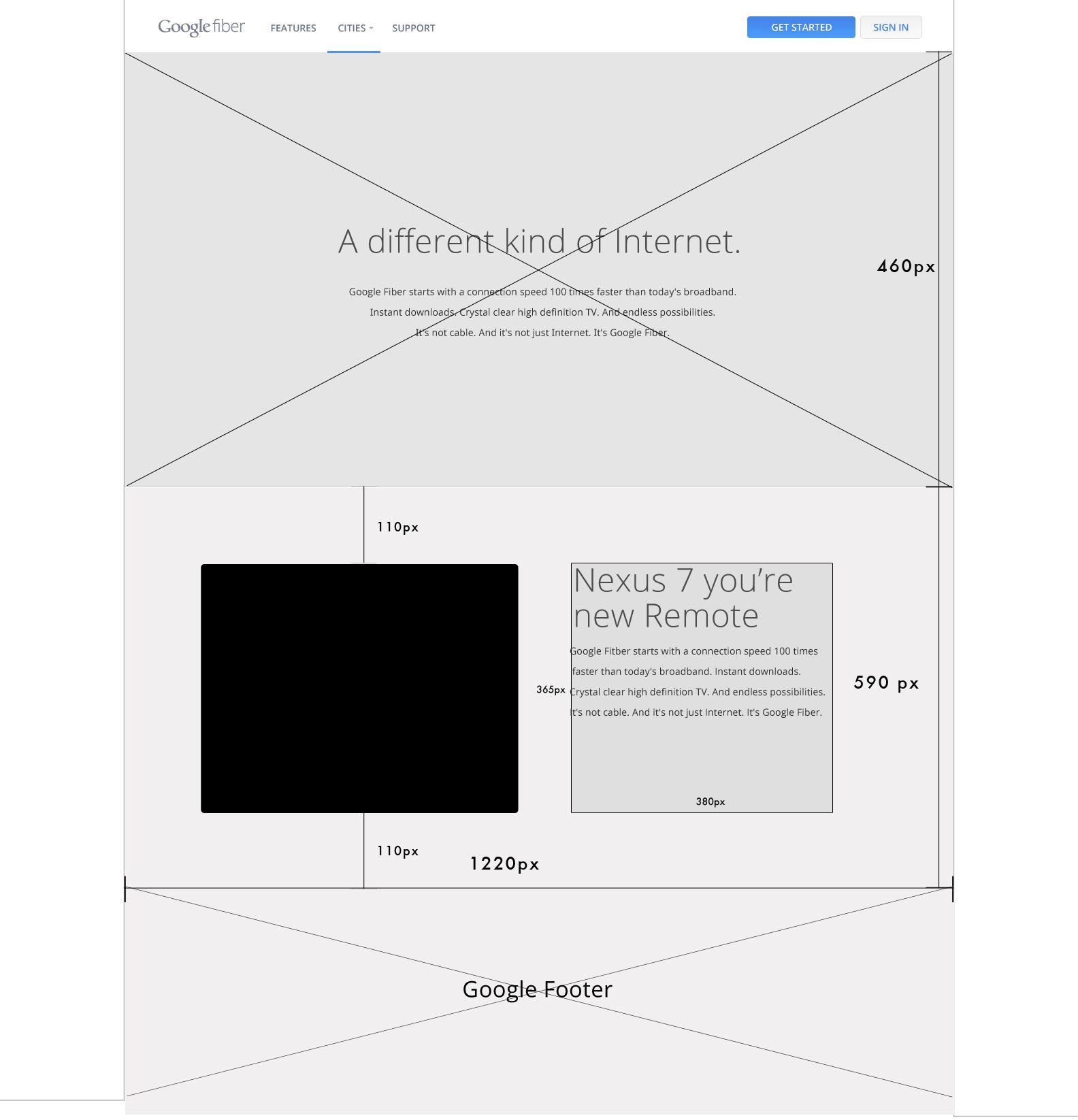 Google Fiber | 2013 Website Brand Identity Style Guide, Home Page design, Channels and Plans page. Visit the live site While working at Left Field Labs, I worked very closely with the Art Director and team to create the homepage style, and concept, Channels and Plans page as well as various other pages throughout the site. Wireframe for Main Site