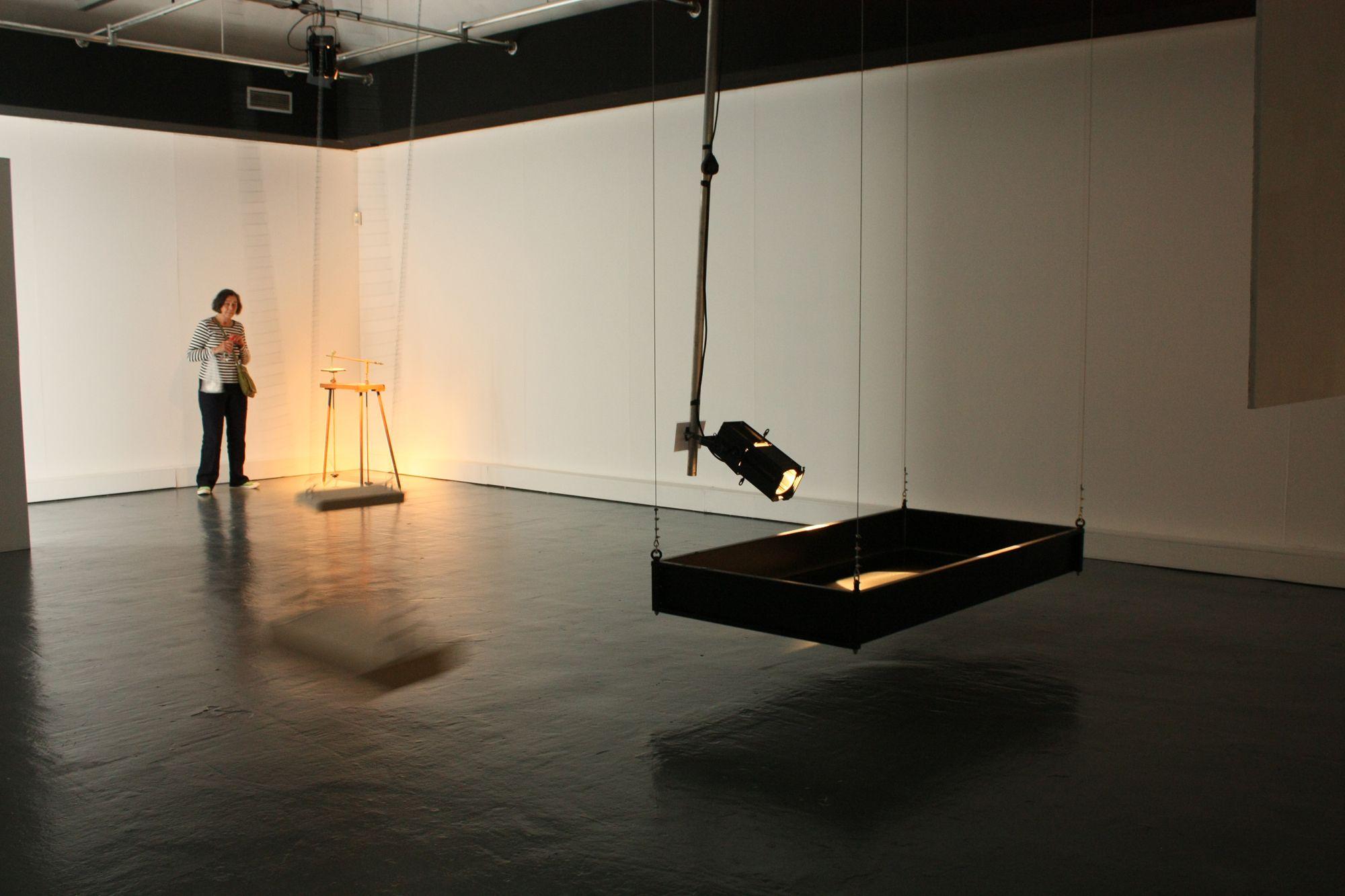 “Granular Graph” is an audio-visual interactive instrument about musical gesture and its notation. The idea is inspired by a pendulum-based scientific instrument called Harmonograph. In its simplest version, two pendulums are suspended through holes in a table. The swinging pendulums cause an attached pen to move, thus creating a curvaceous geometric image on paper that represents harmonies and intervals in musical scales. “Graph” not only re-appropriates the idea of a mechanism by inviting audiences to form a living pendulum through playing on swings, but uses water function as paper, to graph the amount of energy, effort and tension involved in causing the sounds. Any visitor can play the instrument by sitting or standing on one of two swings. The resulting pendular movements alter the waterflow in a tank, generating not only a vibrating pattern but also sounds. The sounds and images can be regarded as forms of dynamic notation that graphically and kinetically represent the audience’s gesture and energy expenditure.