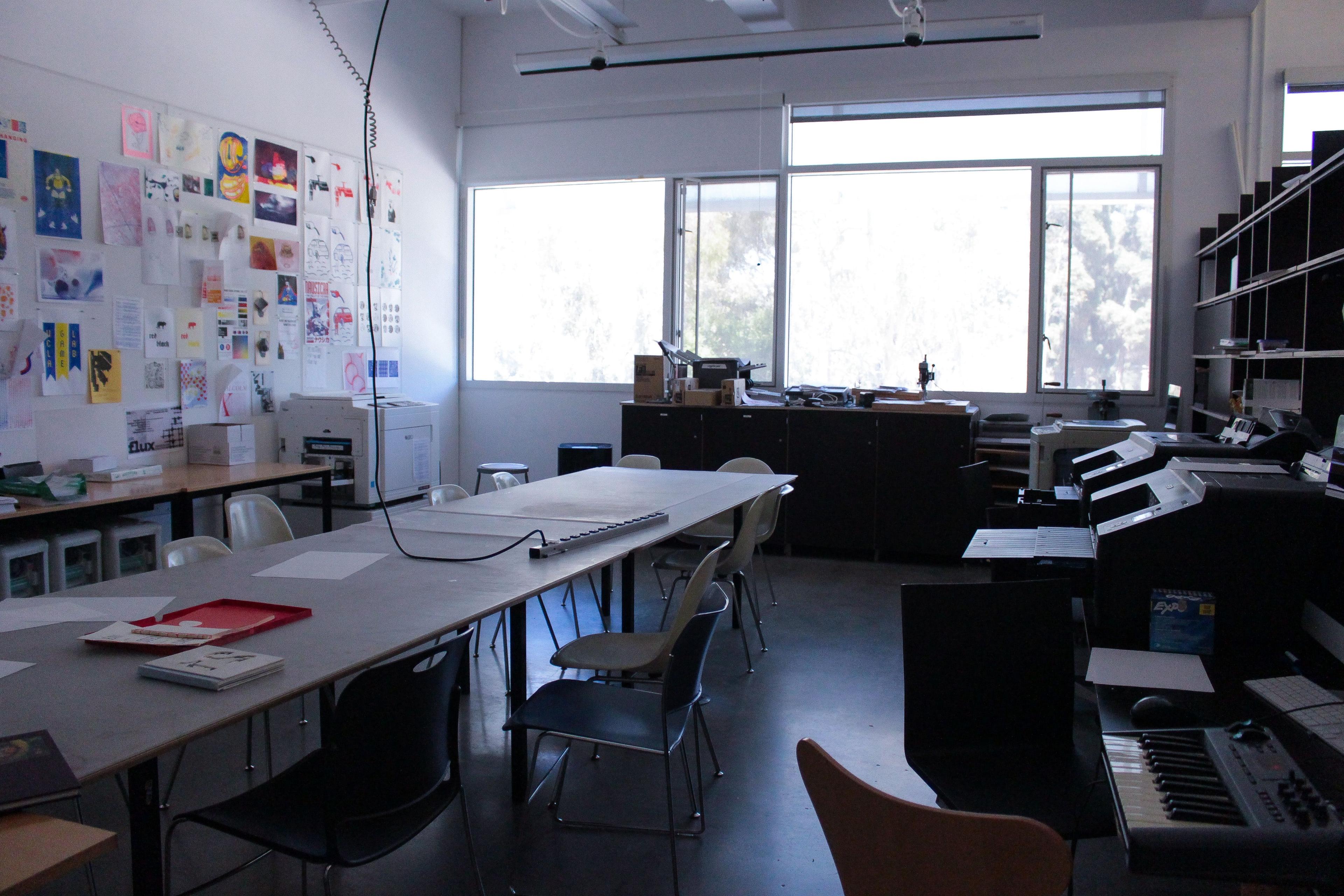 The fabrication and electronics labs provide students and faculty with physical computing and fabrication resources. Located in room 2250 on the second floor of Broad Art Center, the fabrication lab facilitates physical construction across several different media, including wood, metal, and plastics. In addition to traditional manual and powered fabrication equipment, such as table saws, drills, routers, and sanders, the fabrication lab features a growing collection of computer-aided milling and rapid- prototyping facilities. The adjacent electronics lab supports research and development for projects utilizing physical computing with the goal to move away from standard computer interfaces such as monitors and keyboards. The lab provides electronics fabrication resources, including soldering equipment, power supplies, multimeters, oscilloscopes, basic components, and micro controllers. Additionally, the electronics lab functions as a communal site for sharing and documenting physical computing experiments.