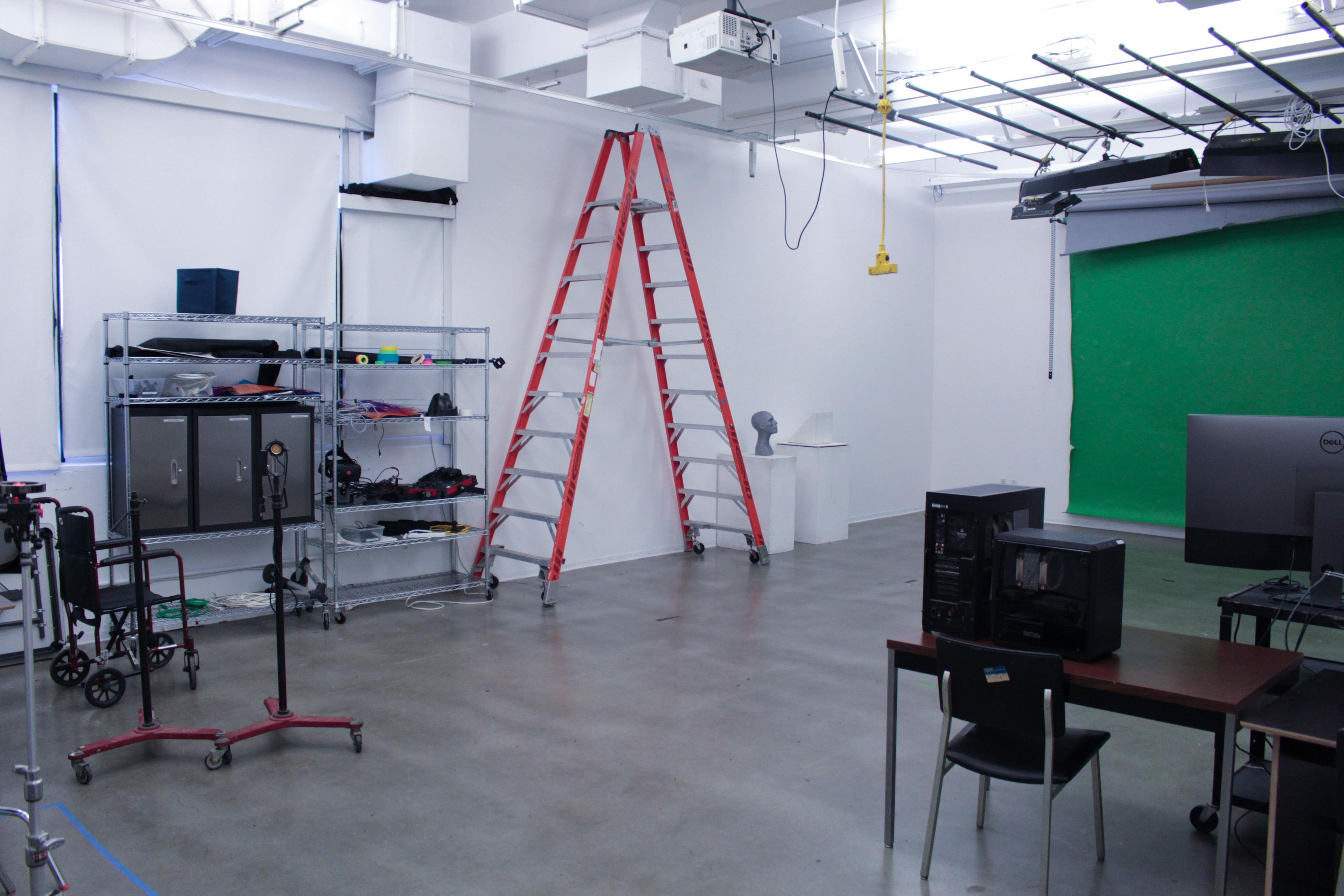 The shoot room is a dedicated studio used for professional photography and video production. The studio is equipped with a variety of lighting options, including moveable kinfolk floods, spots, soft boxes and photography strobes. The studio maintains multiple photography backdrops, a large blue screen and a state-of-the-art Reflecmedia curtain and camera ring for high quality chroma key shoots.