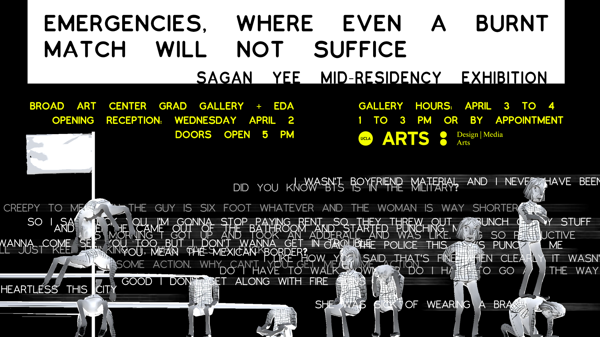 You are invited to the opening reception of Sagan Yee’s DMA MFA mid-residency exhibit, featuring two new works. Originating from a life-long practice of online lurking and in-person eavesdropping, both pieces incorporate found text from real conversations, manually collected and transcribed by the artist over the span of a decade.