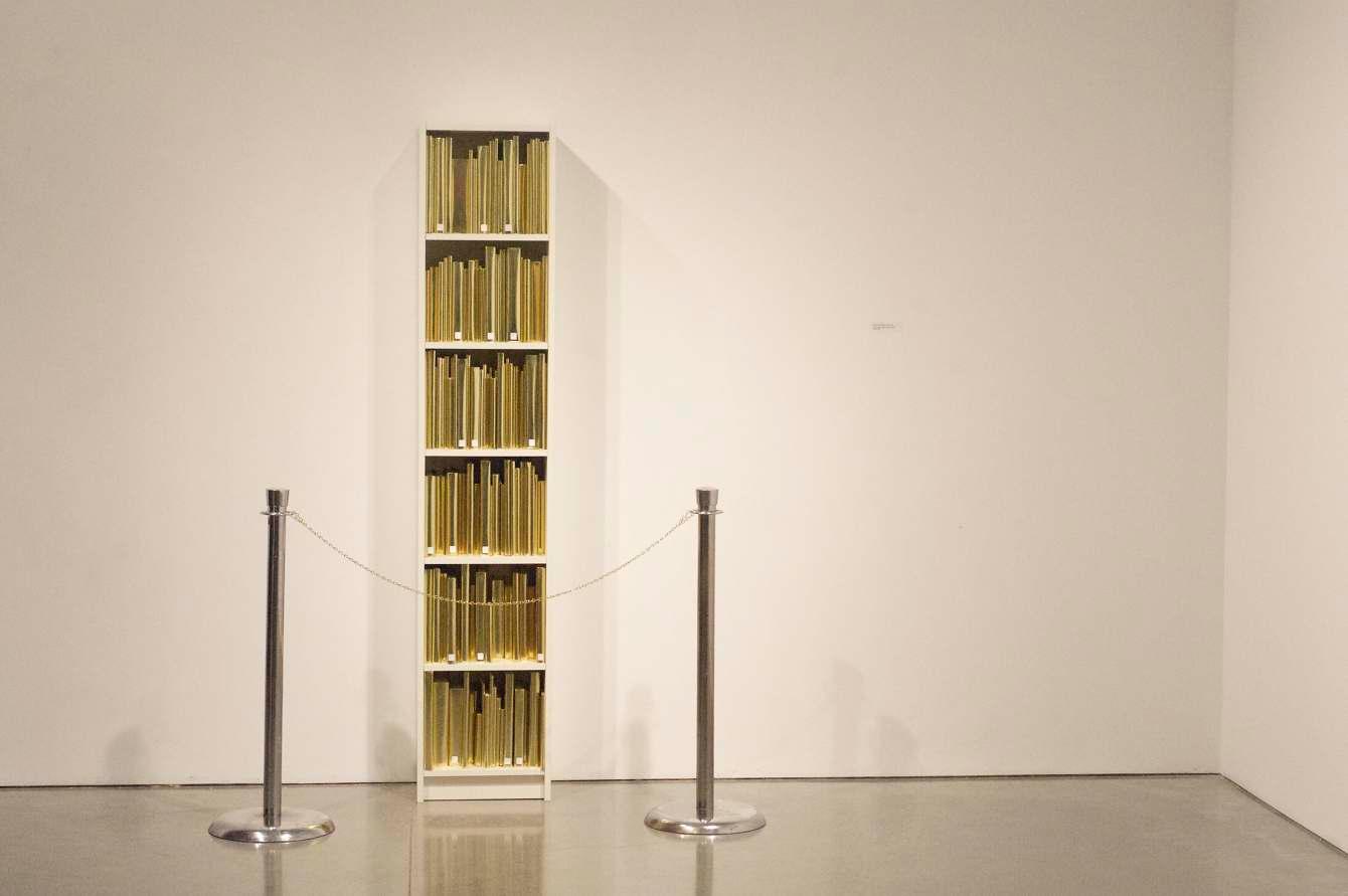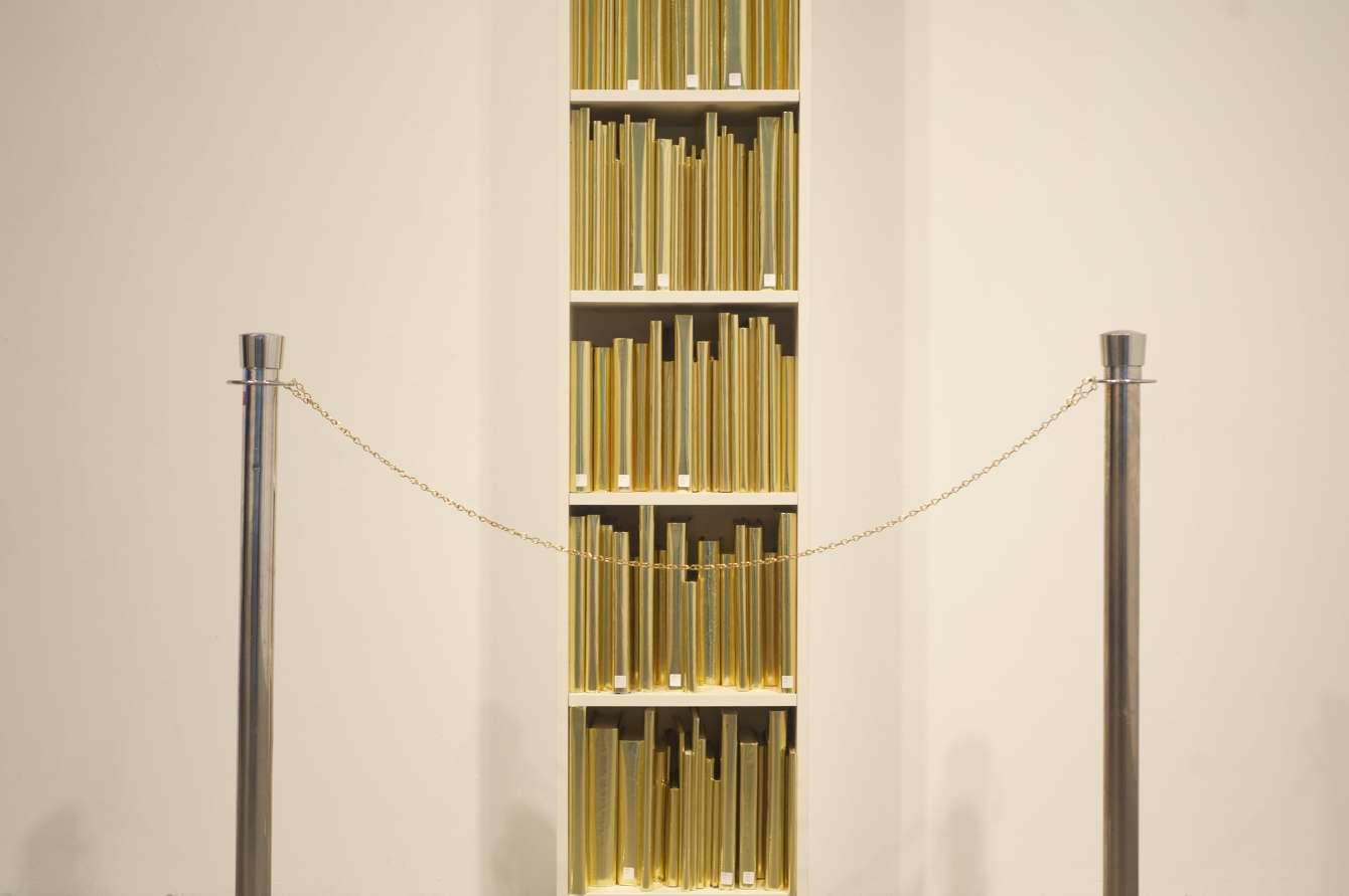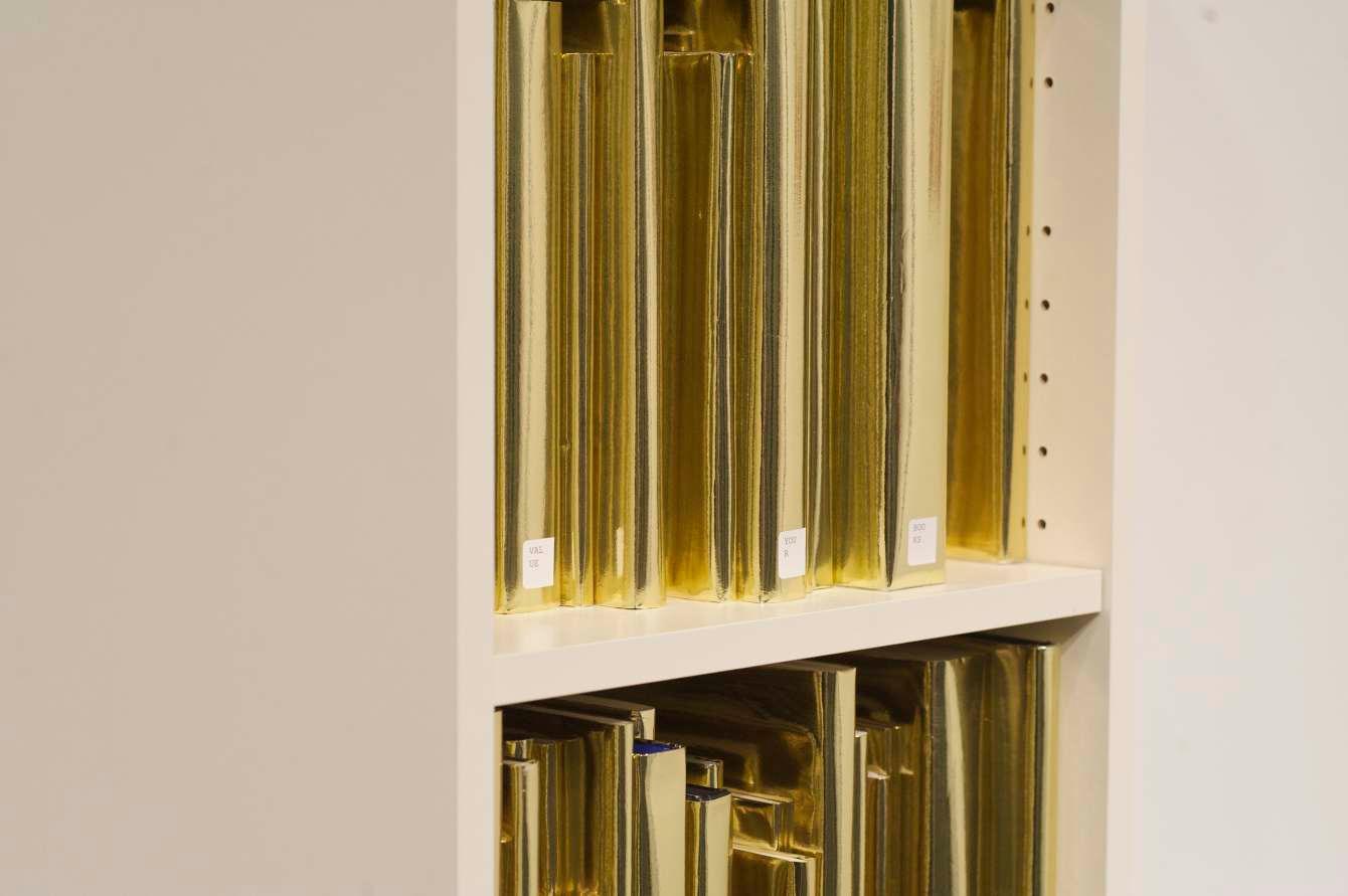 Prev / Next image (1 of 1) Through the intentional displacement of significant amounts of library books from an educational institution (UCLA Arts Library), 735.10 - 735.90 exposes the under-used books available to students by recontextualizing them in an art gallery. 735.10 - 735.90 challenges viewers to reassess the historic value of books and libraries by checking out a bookcase-worth of books from the library for a week. By wrapping the books in gold paper and placing a barrier around the bookshelf, they are stripped from their inherent function as a repository for information, highlighting the shift of books from a referential purpose to a reverential one. Labels on books for each row: 1 Check your privilege 2 Value your books 3 Use your books 4 Use your privilege 5 Use your value 6 Value your privilege Medium: Library books, Wooden Cabinet, Foil Wrapping paper Dimensions: 79.5'' x 15.75'' x 11'' Fullscreen Collaboration between Jonathan Solichin