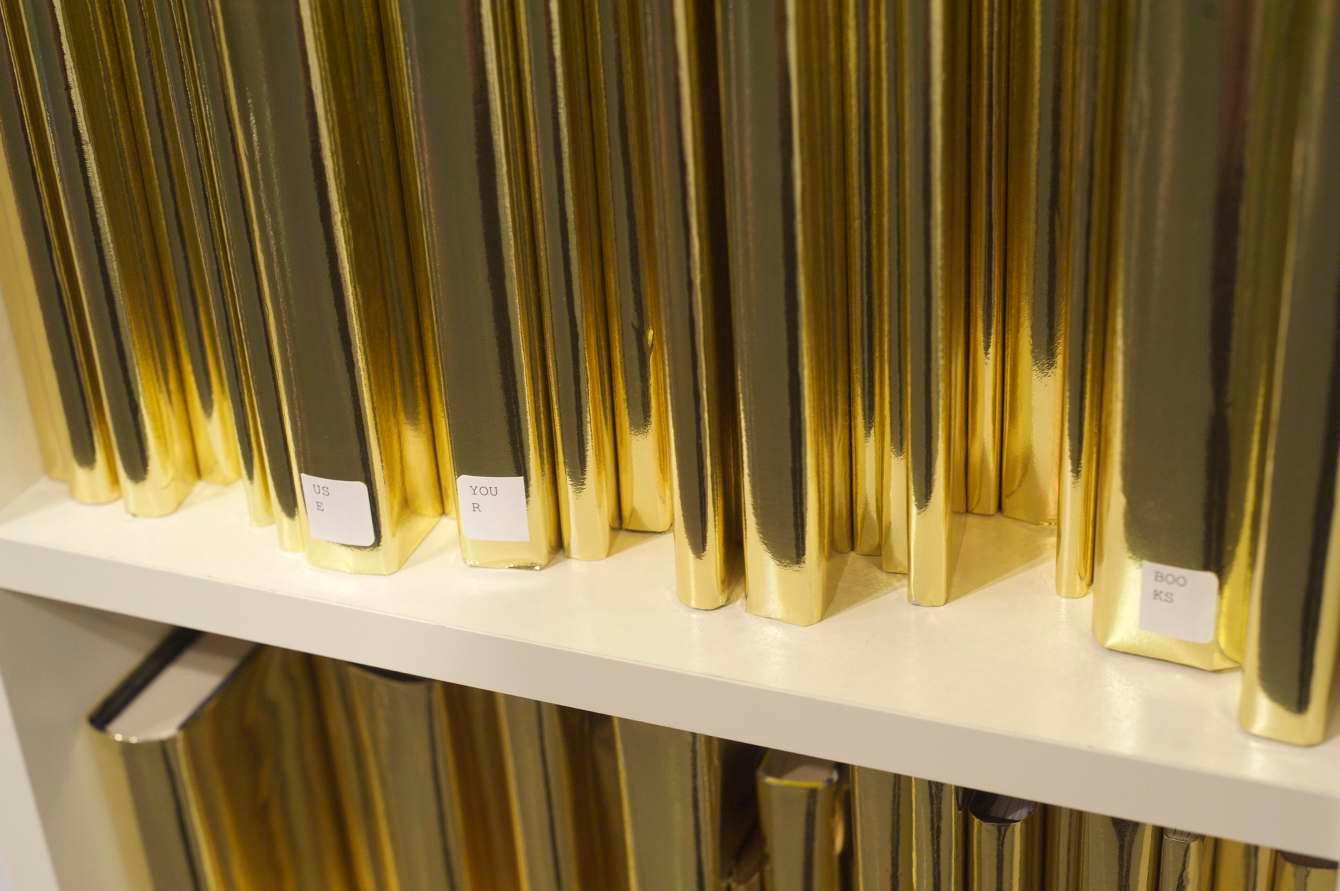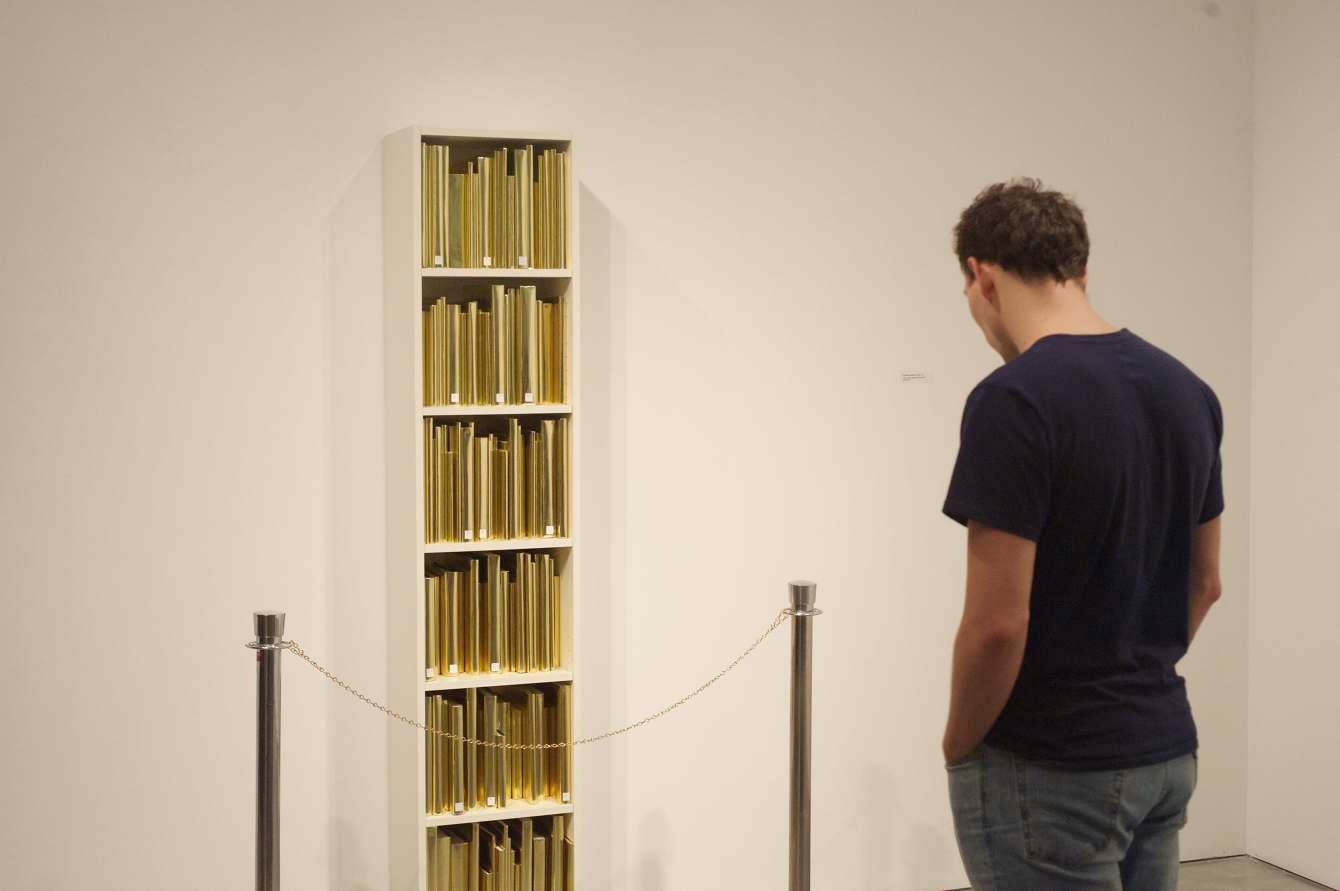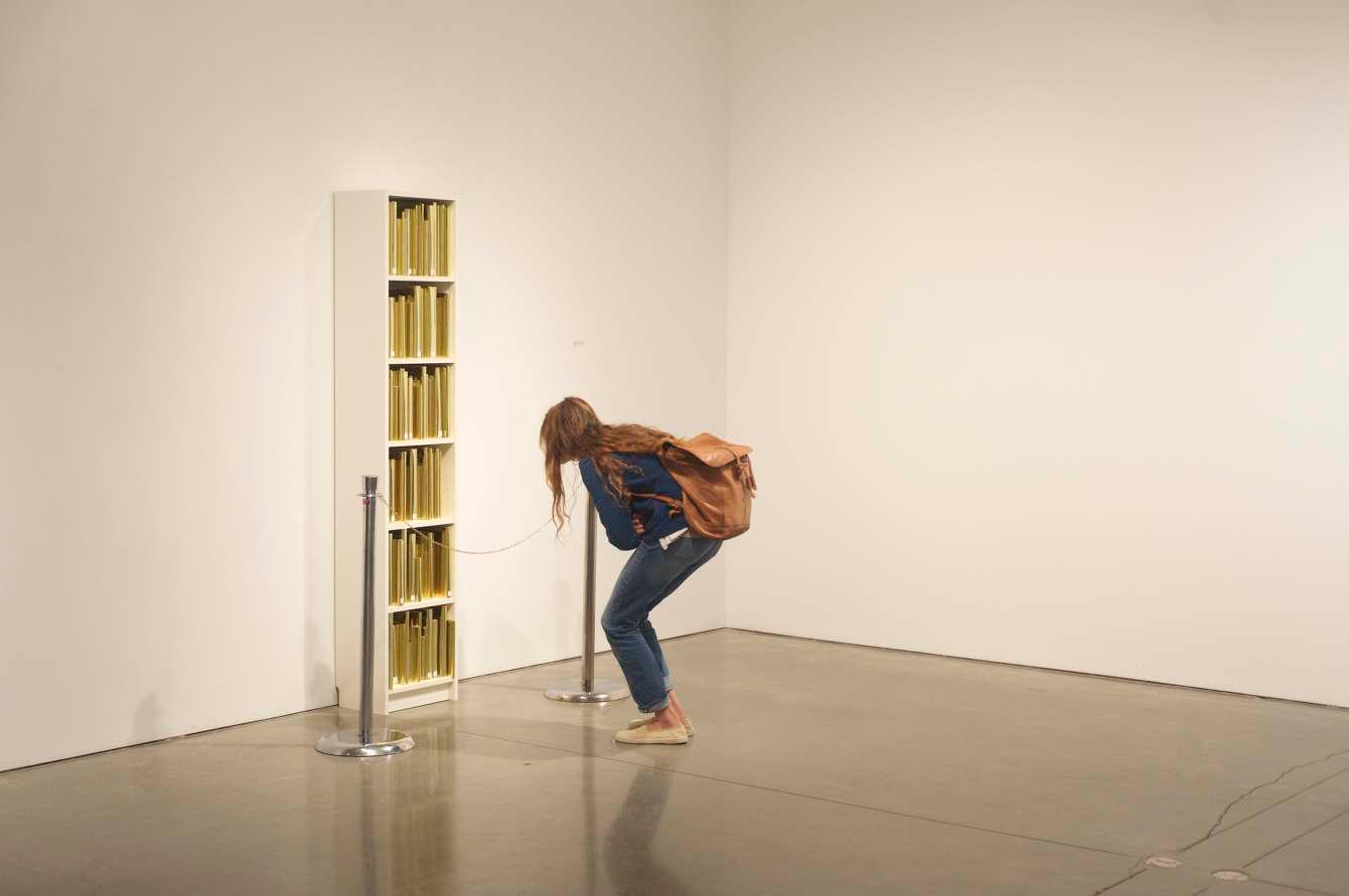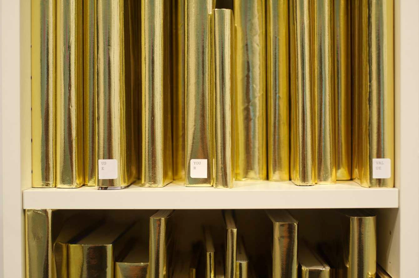 Prev / Next image (1 of 1) Through the intentional displacement of significant amounts of library books from an educational institution (UCLA Arts Library), 735.10 - 735.90 exposes the under-used books available to students by recontextualizing them in an art gallery. 735.10 - 735.90 challenges viewers to reassess the historic value of books and libraries by checking out a bookcase-worth of books from the library for a week. By wrapping the books in gold paper and placing a barrier around the bookshelf, they are stripped from their inherent function as a repository for information, highlighting the shift of books from a referential purpose to a reverential one. Labels on books for each row: 1 Check your privilege 2 Value your books 3 Use your books 4 Use your privilege 5 Use your value 6 Value your privilege Medium: Library books, Wooden Cabinet, Foil Wrapping paper Dimensions: 79.5'' x 15.75'' x 11'' Fullscreen Collaboration between Jonathan Solichin