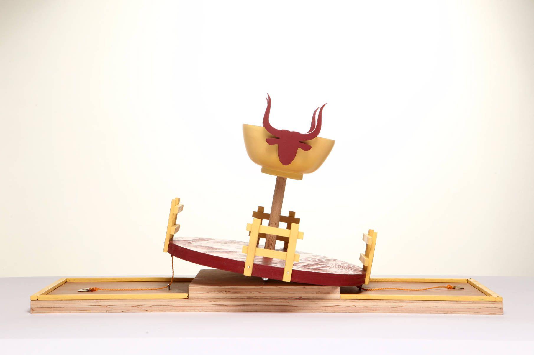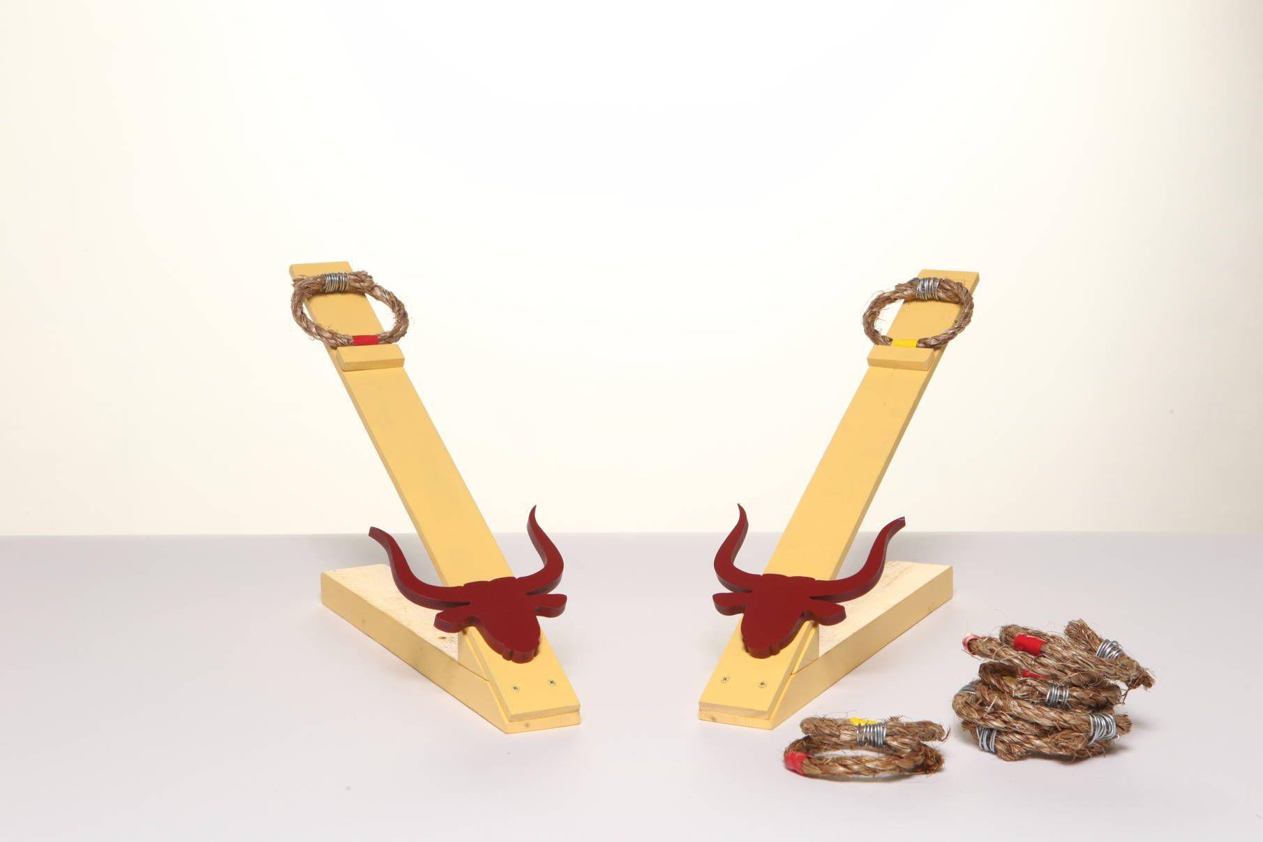 Bull Bowl is a game in which players launch their lasso rings into the bowl to receive points. Addtional points are given if you shoot a lasso onto the horns of the bull. While two players are shooting, two other players are pulling the strings on either side of the bull bowl, creating a moving target for the launchers.