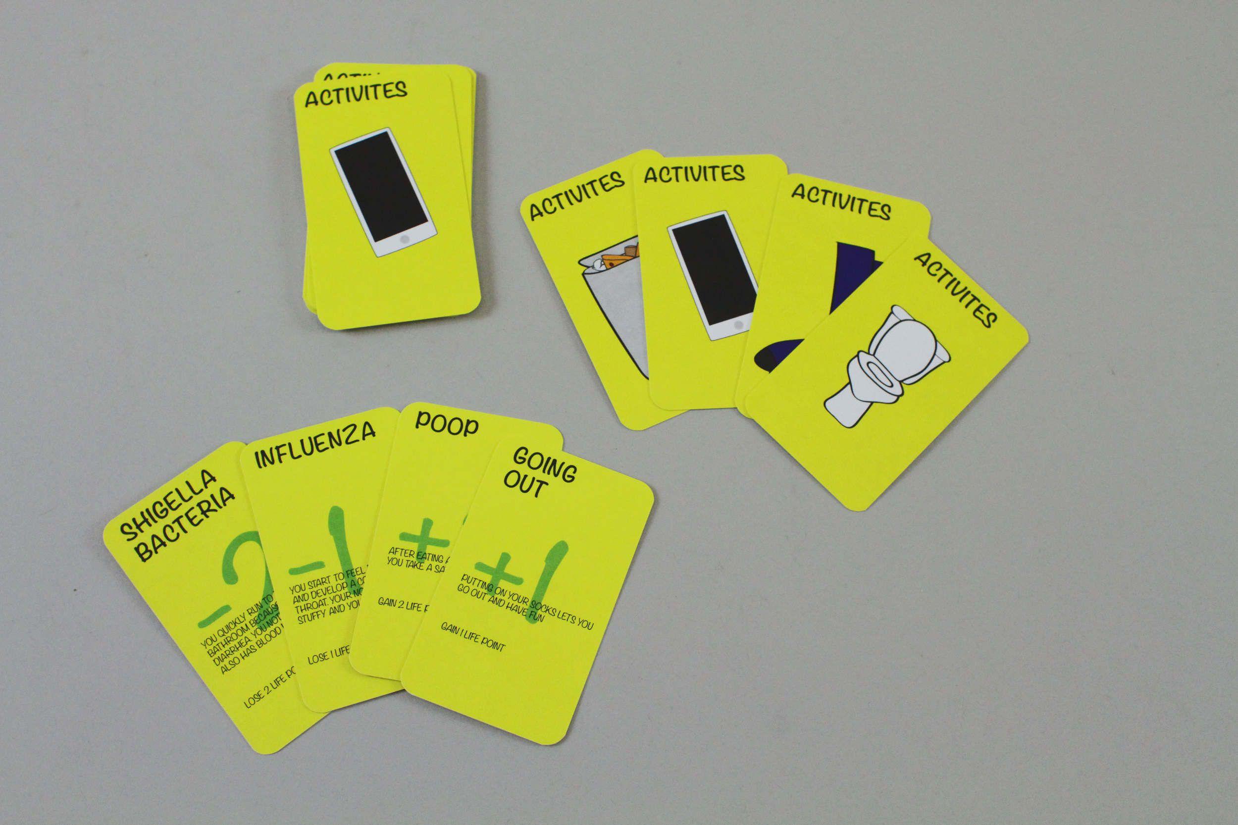 DESMA 157 GAME DESIGN | Final Project Objective: Survive in a germ infested world. Compete against your opponents and wisely choose equipment to protect yourself against your enemies. Players: 5-8 players Game Elements: - three decks of cards - costume attire - game board for each player Inspired by how germaphobic society has become, this game satirizes the idea of germs and bacteria being harmful.