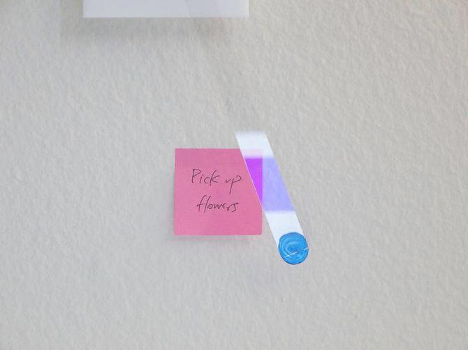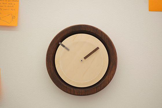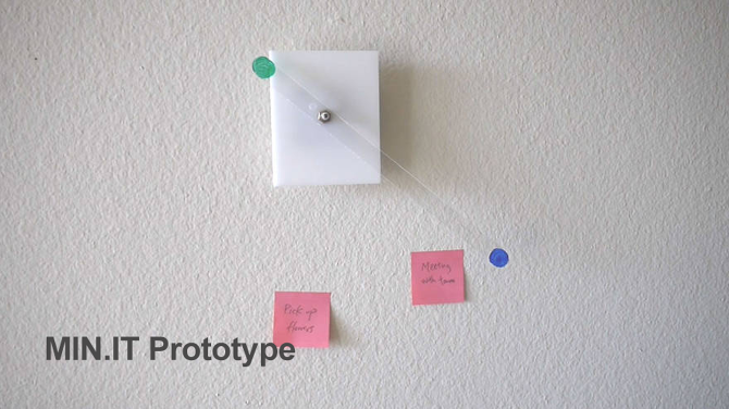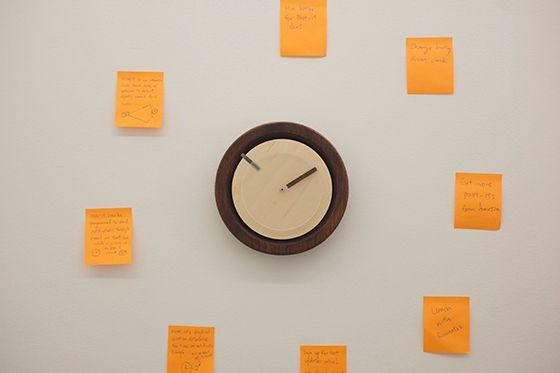 Prev / Next image (1 of 1) MIN.IT is a concept clock that runs on processing and uses computer webcam to recognize post-its placed around the clock as input to trigger notifications. MIN.IT stands for Minimal, Intuitive Notification system with Integrated Time, and was designed to be a collaborative tool for multiple applications. This system creates a physical space where people can share their schedules at work, at home, in a club, or even for a family. Design MIN.IT is minimally designed in order to fit into the workflow of any environment. The setup of MIN.IT comprises of a webcam connected to a computer, and a clock with an hour hand. MIN.IT detects colors and can be calibrated for different lighting. Future Applications The technology behind MIN.IT can also have other applications, such as creating a communication platform for people who are not comfortable with technology. By creating a bridge between the virtual and the physical world, people can choose to send a text message by simply pasting a post it note on MIN.IT. By adding magnets, MIN.IT could also be used as a communication tool between family members in order to get notification about meals, groceries or transportation schedules. Material: Acrylic, Wood Dimensions: 20'' x 20'' x 1'' Fullscreen Made in Eddo Stern's "Senior Project: Interactivity and Games" Class, Winter 2014 & Refined in Chandler McWilliams's "Senior Project: Interactivity and Games" Class, Spring 2014