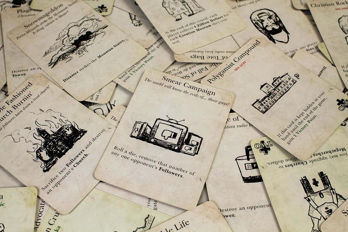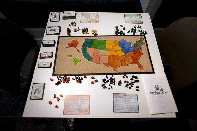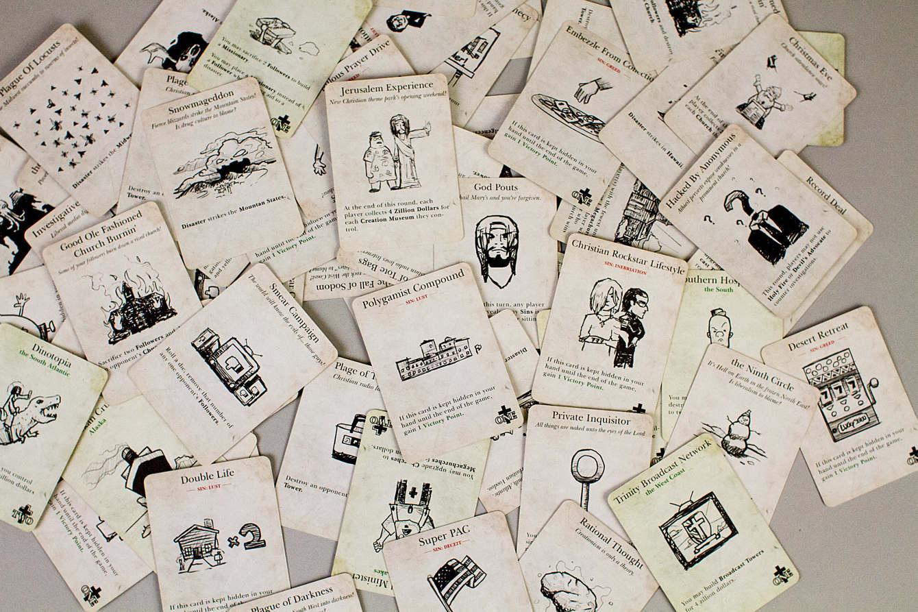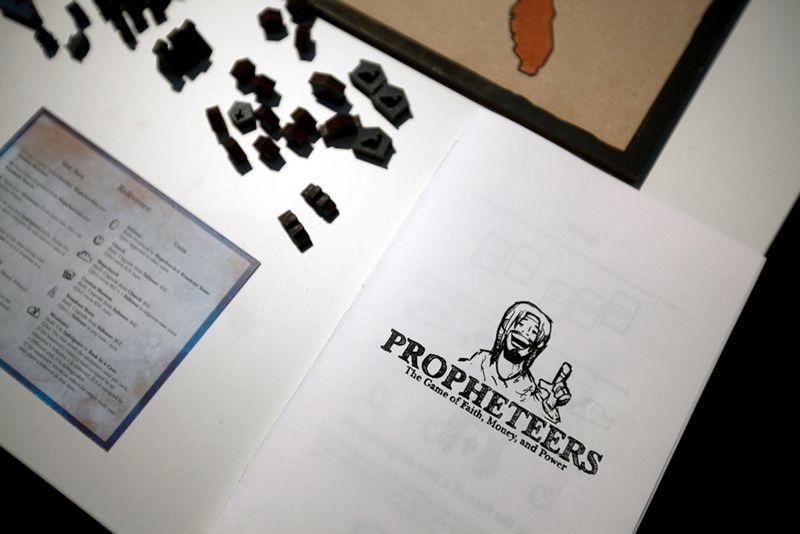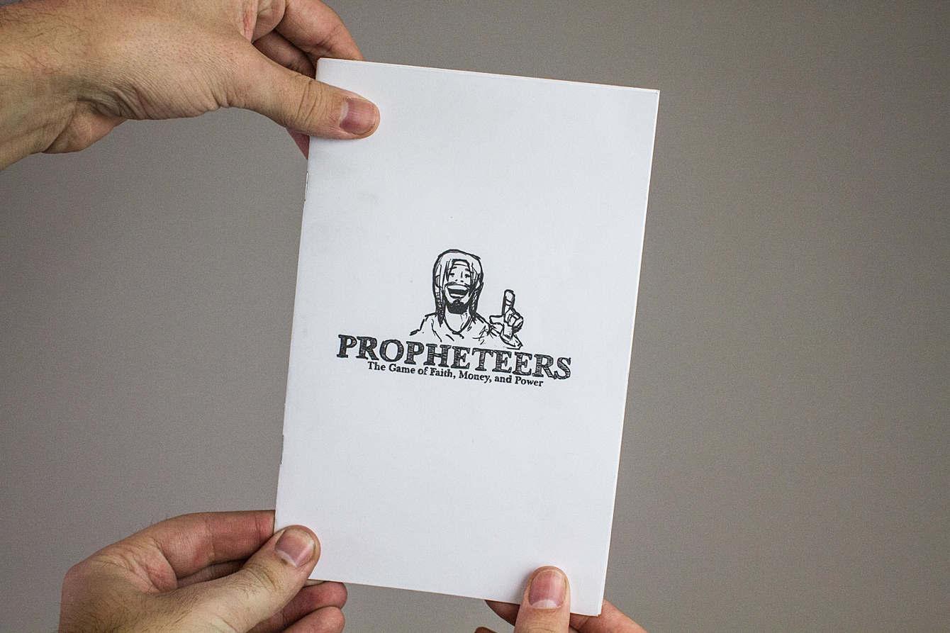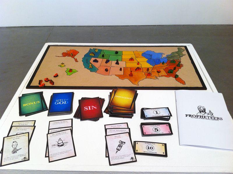 Propheteers (2013) multiplayer strategy board game Previous / Next image Propheteers is a competitive board game for four players where each player becomes the face of an evangelical empire of mega churches, radio talk shows, and creation museums. The player who manages to collect the most sins (including everything from prostitutes to super PACs to cocaine) and keep them hidden until the final Act of God is the winner. as seen at: GAME GAZER - SWISSNEX SF, SAN FRANCISCO CA - 2013 AMBER FESTIVAL - ISTANBUL, TURKEY - 2013 RECESS - NEW WIGHT GALLERY, LOS ANGELES, CA - 2012
