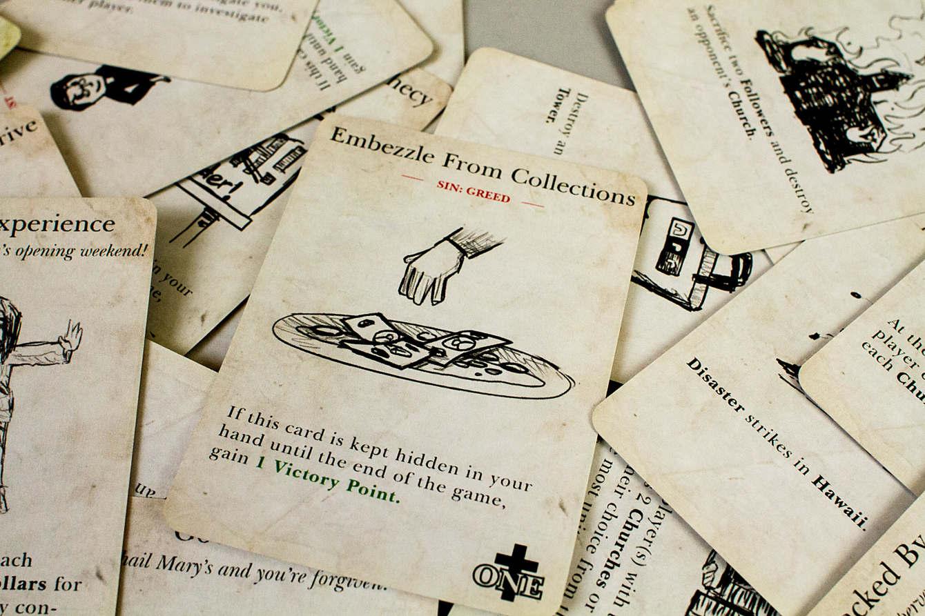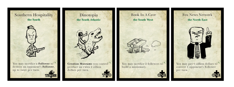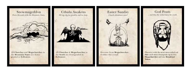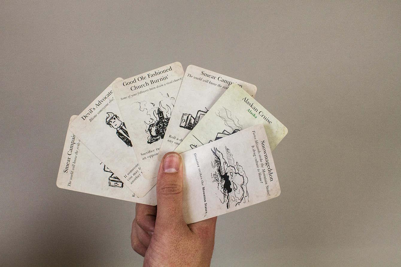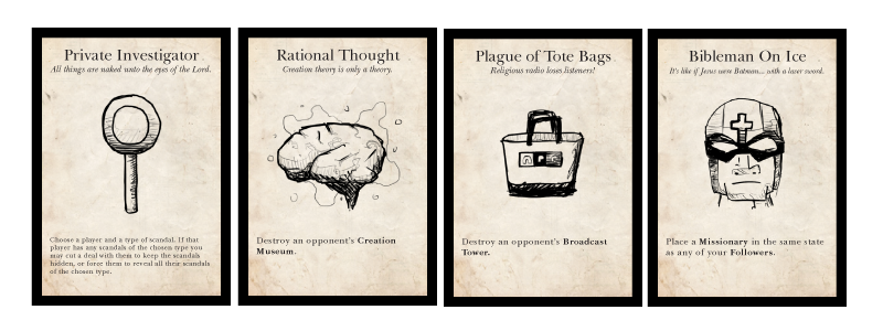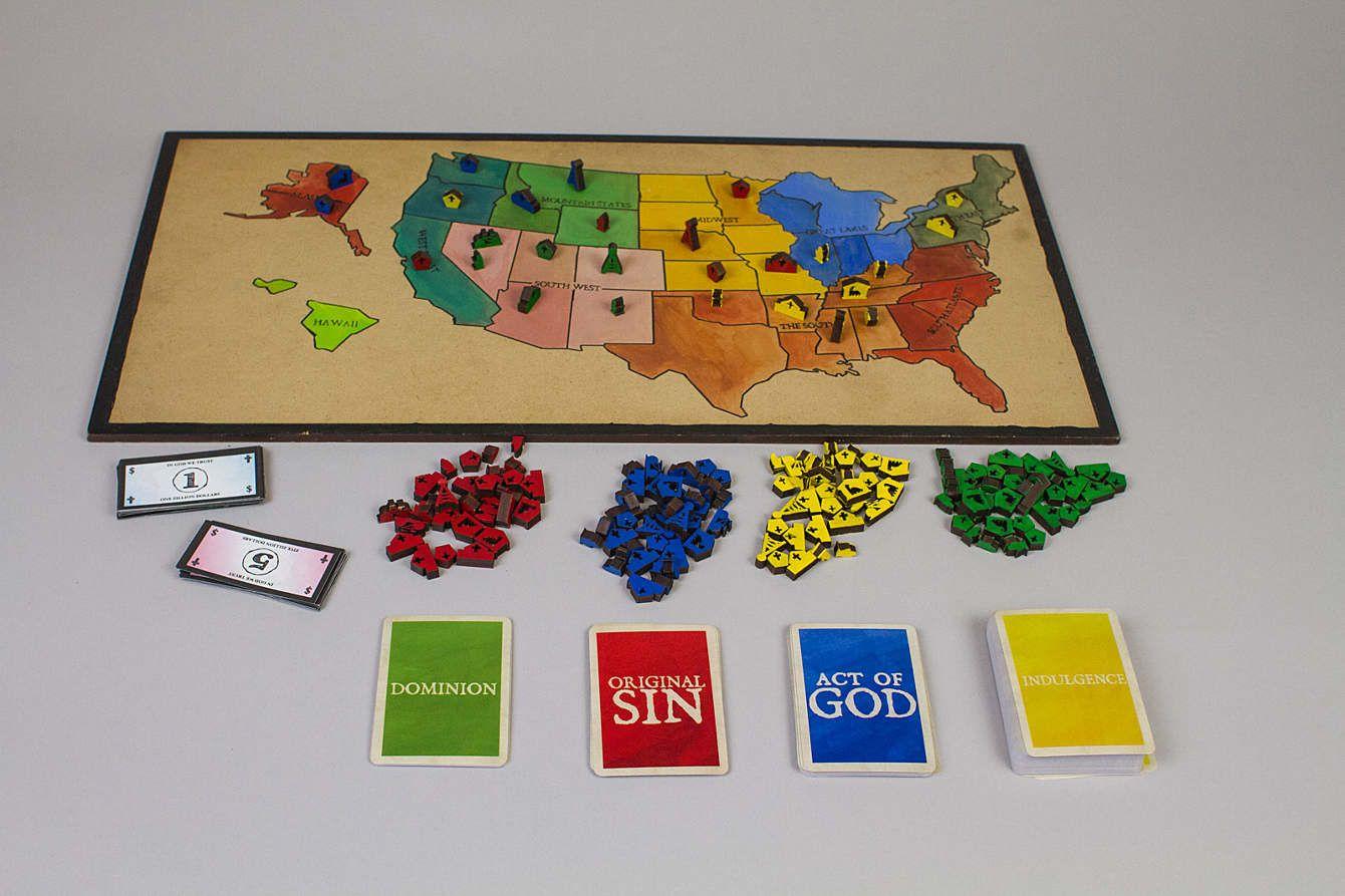 Propheteers (2013) multiplayer strategy board game Previous / Next image Propheteers is a competitive board game for four players where each player becomes the face of an evangelical empire of mega churches, radio talk shows, and creation museums. The player who manages to collect the most sins (including everything from prostitutes to super PACs to cocaine) and keep them hidden until the final Act of God is the winner. as seen at: GAME GAZER - SWISSNEX SF, SAN FRANCISCO CA - 2013 AMBER FESTIVAL - ISTANBUL, TURKEY - 2013 RECESS - NEW WIGHT GALLERY, LOS ANGELES, CA - 2012