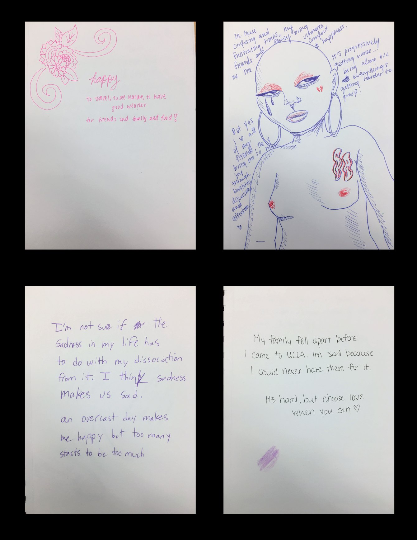 This performance art piece was done in order to showcase the personal lives of strangers. Through this project, participants felt comfortable anonymously leaving their stories or personal facts about themselves in a notebook. Dimensions: 8 in x 6 in Materials used: Pens, markers, sketchbook, index cards